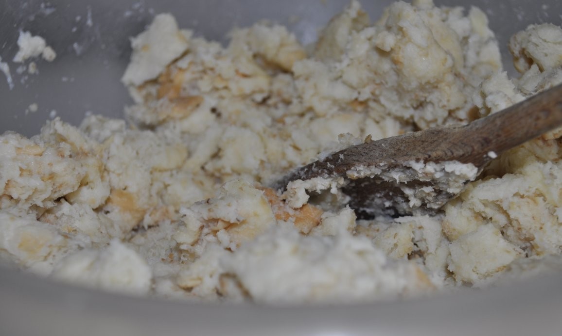 Privare i panini di quasi tutta la crosta,tagliatelo a pezzi e metterli in una ciotola, scaladare il latte e versarlo sul pane. Il pane deve risultare bagnato e deve avere assorbito tutto il latte, se rimane latte residuo sul fondo della ciotola toglietelo, altrimenti vi rovinerà l’impasto.