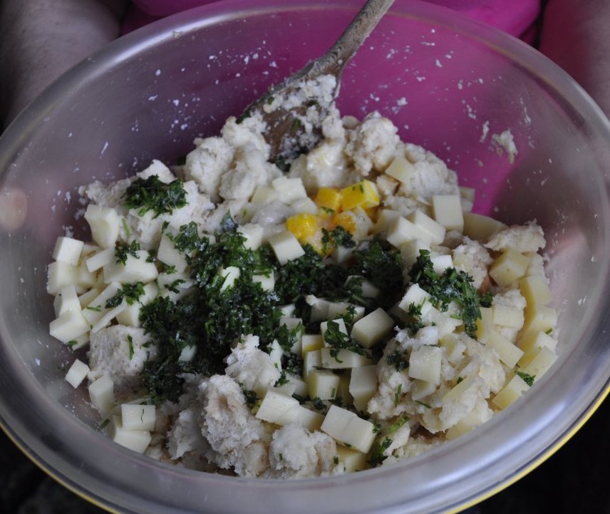 Aggiungete infine il formaggio a cubetti e la farina e impastate, il risultato deve essere quello di un impasto morbido, non eccessivamente duro, quindi non esagerate con la farina.