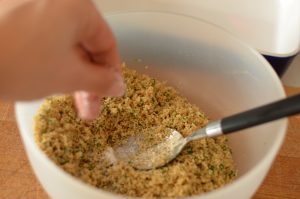 Come prima cosa accendere il forno modalità ventilato a 220°. Nel frattempo preparare la panatura: in una ciotola aggiungere il pan grattato, l’aglio in polvere, una presa di sale, l’olio e il prezzemolo, mescolare fino ad avere un composto granuloso ma piuttosto compatto.